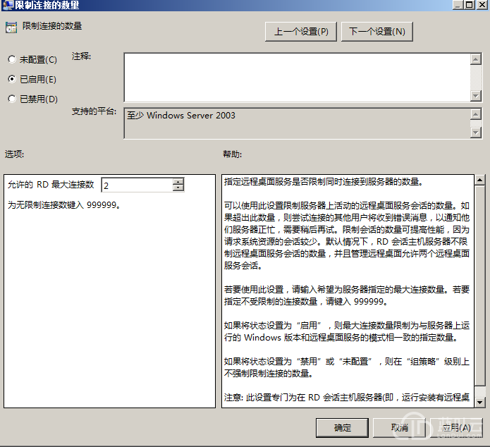 1.在運(yùn)行中輸入gpedit.msc,依次打開”計(jì)算機(jī)配置”——”管理模板”——”windows組件”——”遠(yuǎn)程桌面服務(wù)”——”遠(yuǎn)程桌面會(huì)話主機(jī)”——”鏈接”——雙擊右側(cè)的”限制鏈接的數(shù)量”——設(shè)置已啟用和最大鏈接數(shù)。