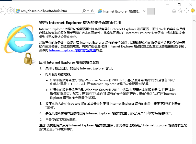 5. 開啟 Internet Explorer 時,也會顯示【未啟用 Internet Explorer 增強的安全配置】警告信息。