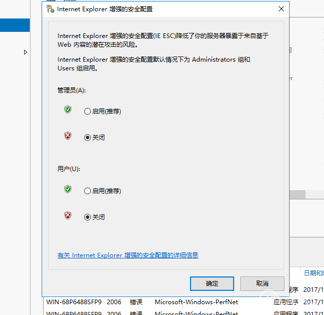 3. 您可以針對【系統(tǒng)管理員】或【使用者】啟用或關閉【Internet Explorer 增強的安全配置】,完成設置后按【確定】。