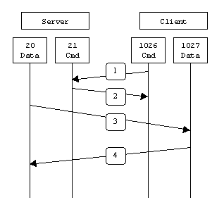 在第1步中,客戶端的命令端口與FTP服務(wù)器的命令端口建立連接,并發(fā)送命令“PORT 1027”。然后在第2步中,F(xiàn)TP服務(wù)器給客戶端的命令端口返回一個"ACK"。在第3步中,F(xiàn)TP服務(wù)器發(fā)起一個從它自己的數(shù)據(jù)端口(20)到客戶端先前指定的數(shù)據(jù)端口(1027)的連接,最后客戶端在第4步中給服務(wù)器端返回一個"ACK"。
