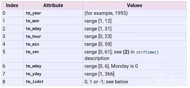 二者都返回一個類struct_time的實例,該實例具有如下屬性:
