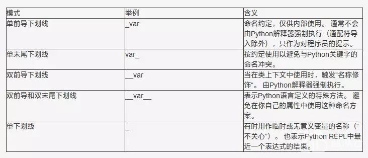 以下是一個(gè)簡(jiǎn)短的小結(jié),即"速查表",羅列了我在本文中談到的五種Python下劃線模式的含義: