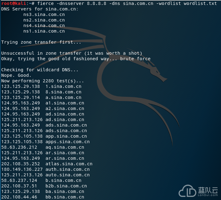 root@kali:~# fierce -dns baidu.com -wordlist hosts.txt /tmp/output.txt