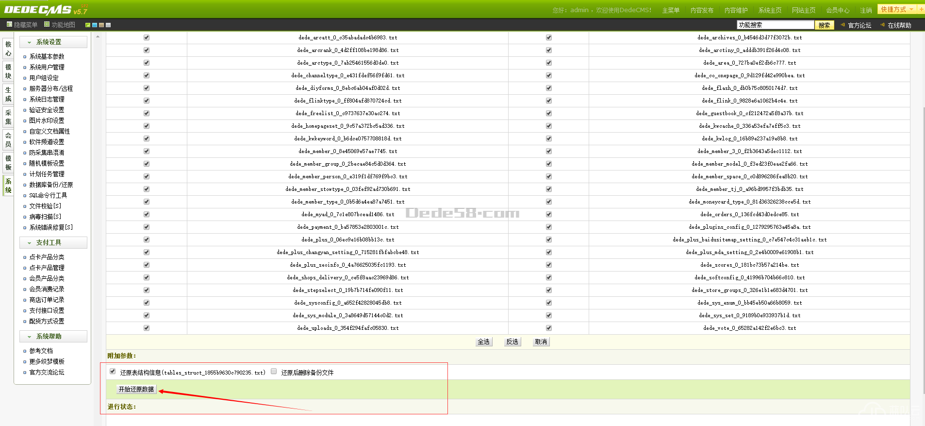 2.安裝好后,在后臺(tái)“系統(tǒng)”—“數(shù)據(jù)庫備份/恢復(fù)”,點(diǎn)右上角“還原數(shù)據(jù)”—“開始還原數(shù)據(jù)”,恢復(fù)數(shù)據(jù)庫。